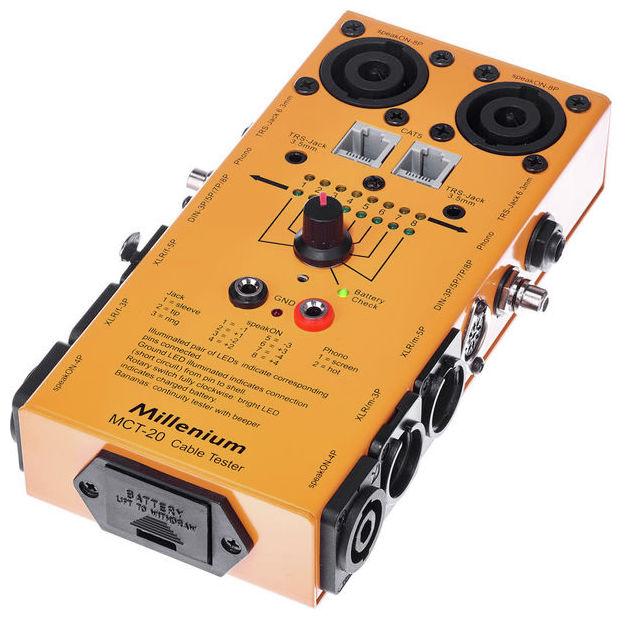 LED-es hibakijelző Elemtöltöttség LED XLR, assym./sym. Jack(6,3 mm és 3,5 mm), Speakon 4 + 8 Pol, Cinch, DIN (5 pol.), Cat5 Elemmel együtt
