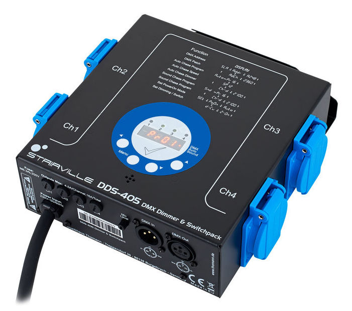 Terhelhetőség csatornánként 5 A Terhelhetőség össz.: 16 A 3 pólusú DMX be- és kimenet LED kijelző Beépített mikrofon állítható érzékenységgel Programozható Chaser (futófény) Állítható sebességű Chaser Manuális dimmerelés csatornánként Méret: 20 x 6,5 x 18 cm Súly: 2 kg